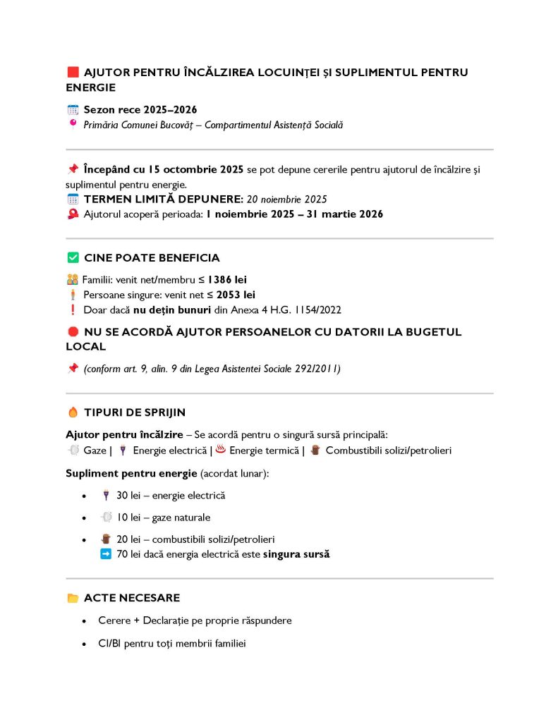 Începând cu 15 octombrie 2025, Compartimentul de Asistență Socială din cadrul Primariei Bucovat, demarează acțiunea de preluare a cererilor – declarație pe propria răspundere pentru acordarea ajutorului pentru încălzirea locuinței și a suplimentului pentru energie, în vederea aplicării prevederilor Legii nr. 226 din 16 septembrie 2021 privind stabilirea măsurilor de protecție socială pentru consumatorul vulnerabil de energie și a Normelor metodologice de aplicare a acesteia, aprobate prin H.G. nr. 1154/2022, pentru sezonul rece 01 noiembrie 2025 – 31 martie 2026.