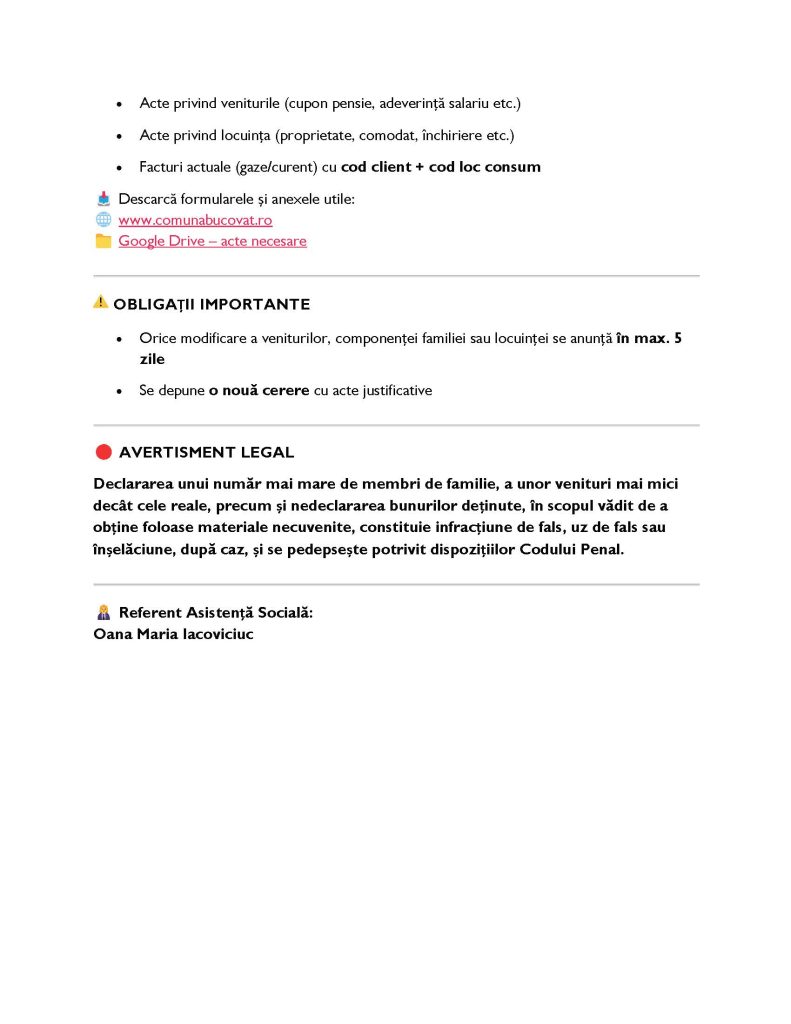 Cererea și alte documente utile (Lista bunurilor ce conduc la excluderea acordării ajutorului cuprinse în Anexa nr.4, Anexa 5 – declarație pe proprie răspundere, Listă acte necesare) se pot descărca de aici: